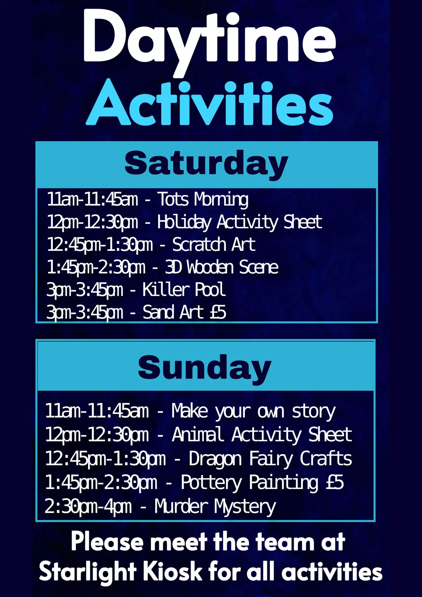 Our entertainment team is dedicated to giving you the best experience when you are here with us, we have something for all ages from our kids time, featuring our very own park mascot Peter Panda, laser tag, football and archery for our teens and right up to our adult guests with music, games and much more. this season is shaping up to be our best year yet.